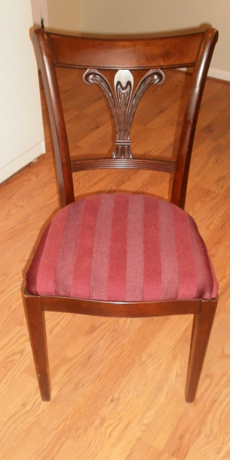 I've never recovered anything, but when we inherited these dining chairs, I knew that dated red striped fabric had to go! I purchased a fabric dropcloth from Lowe's and got started!