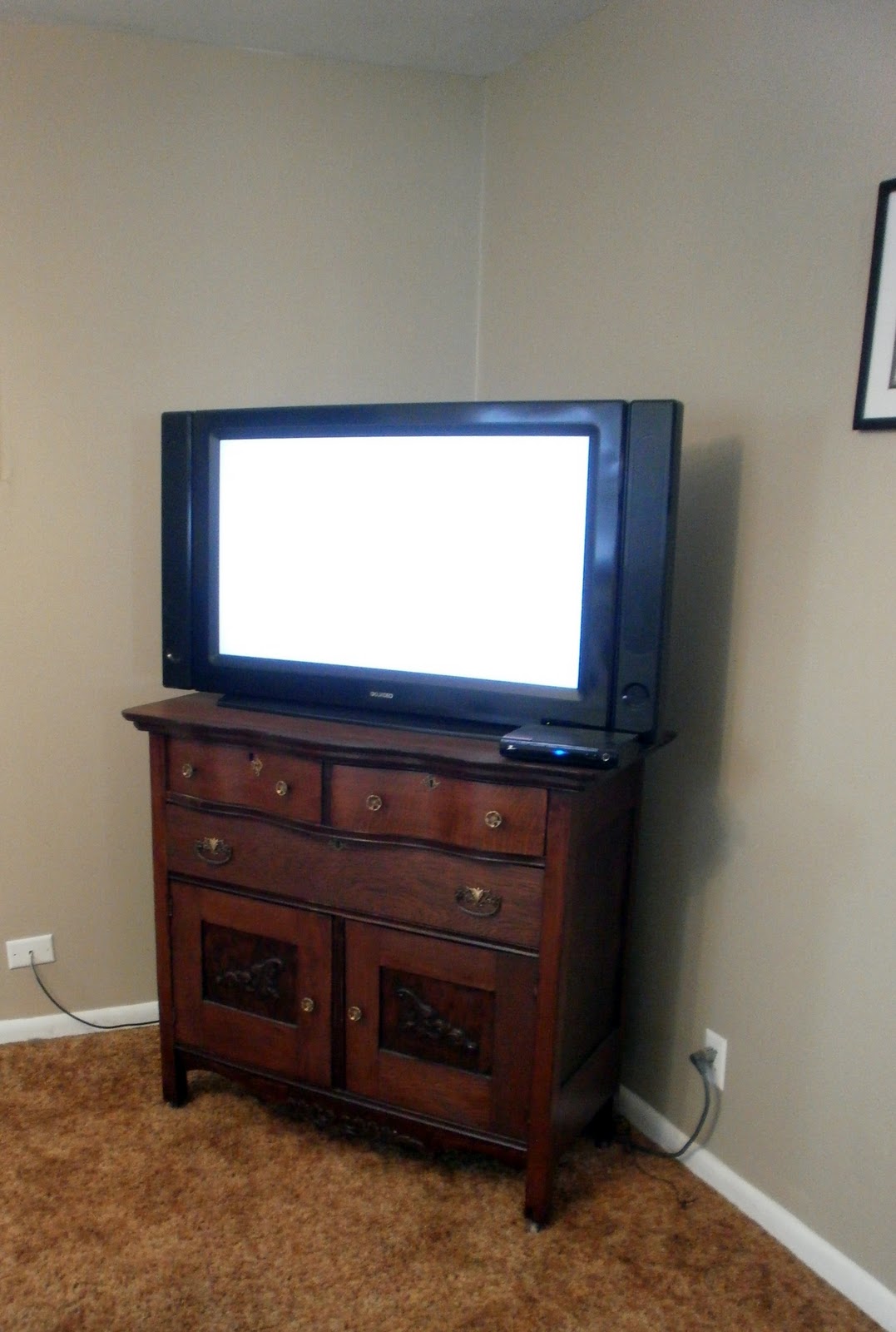 This is the corner across from the sofa. I love the antique dresser my fiance refinished.